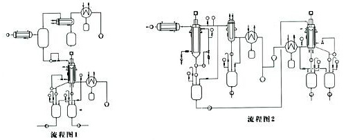 a)短程蒸餾器單級(jí)蒸餾單元: 經(jīng)預(yù)熱、脫氣后的物料進(jìn)入短程蒸餾器,輕組份被蒸發(fā)并在內(nèi)置冷凝器上冷凝,它和重組份從不同的通道分別排出(流程圖1)。 b)刮膜蒸發(fā)器和短程蒸餾器組合蒸餾單元: 大量的低沸物在刮膜蒸發(fā)器里被除去,產(chǎn)品的蒸餾在后級(jí)的短程蒸餾器里產(chǎn)生(流程圖2)。  |